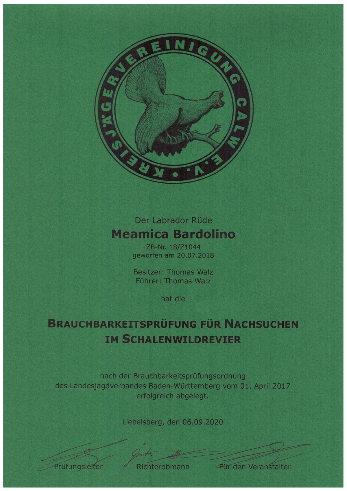 Bines Wurfbruder konnte seine jagdlichen Fähigkeiten erfolgreich unter Beweis stellen und die Brauchbarkeitsprüfung für Nachsuchen im Feld und im Schalenwildrevier ablegen.